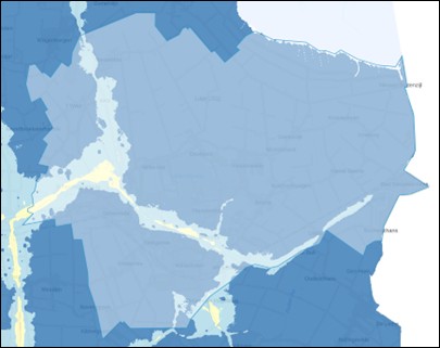 Door klimaatverandering neemt de kans op meer en langere perioden van extreme neerslag toe. De plaatsgebonden overstromingskans geeft de kans dat een locatie in één jaar te maken krijgt met een bepaalde overstroming.De onderstaande kaart laat zien wat de totale overstromingskans is vanuit het primaire en regionale watersysteem samen. De kaart geeft de totale overstromingskans in 2050 weer bij een overstromingsdiepte van meer dan 0 cm (alle overstromingsscenario's in beeld). Op de kaart is te zien dat het grootste deel van Oldambt een kleine overstromingskans heeft die ligt tussen de 1x per 300 tot 1x per 3000 jaar. Aan de kust is de overstromingskans groter, richting het zuiden is de kans juist kleiner.