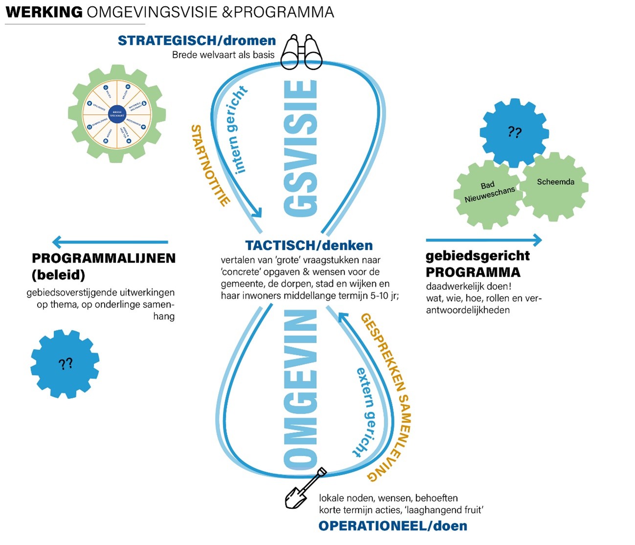 Bij elk van de ambities geven we aan waar we op inzetten en hoe we dat doen. Voor deze laatste ‘hoe-vraag’ zoeken we waar dat kan de verbinding met de programmalijnen die vanuit het NPG Lokaal Programma Oldambt zijn neergezet. Zo verbinden we in de uitwerking Omgevingsvisie en Lokaal Programma met elkaar. Dat is voor inwoners helder, dat voorkomt dubbel werk en dat maakt het realiseren van koppelkansen veel gemakkelijker.