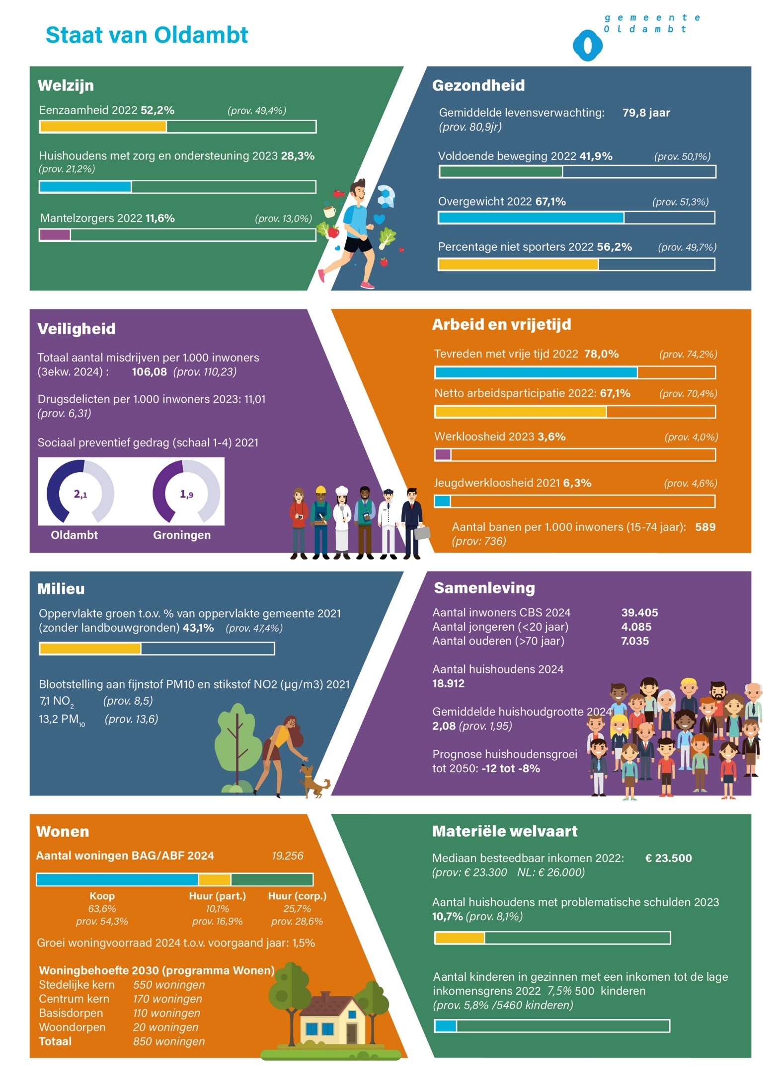 Uit allerlei onderzoeken en monitors blijkt dat in Oldambt de brede welvaart van veel inwoners relatief vaak lager is dan elders in de provincie of in Nederland. Oldambt kleurt rood in diverse staatjes die onder andere de werkelijke of ervaren waarden rond welzijn, samenleving en gezondheid verbeelden. Voor ons is dat een grote zorg. In onze gemeente wonen relatief veel mensen met een laag inkomen en een lage opleiding. Hun sociaal -economische status is laag. Vaak gaat deze lage status gepaard met een mindere gezondheid. Het is bekend dat mensen met een lage status gemiddeld 7 jaar korter leven waarvan 19 jaar in minder goede gezondheid dan hoger opgeleiden. Dat betekent dat in onze gemeente relatief veel inwoners al vanaf hun zestigste een minder goede gezondheid ervaren en daarmee een ‘mindere kwaliteit van leven’. Veel inwoners geven aan zich eenzaam te voelen, jongeren en jongvolwassenen geven aan een toenemende druk op het dagelijks leven te voelen.