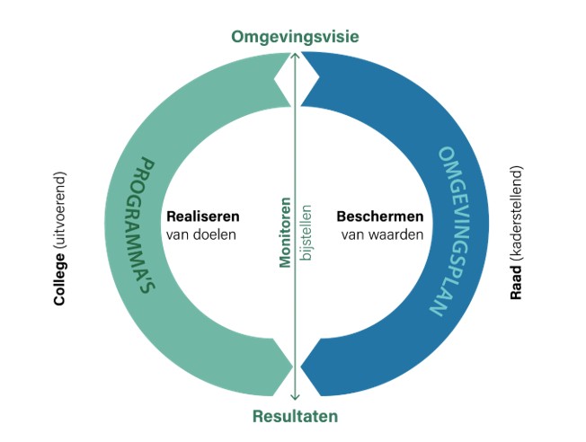 De Omgevingsvisie is een onderdeel van de Omgevingswet. In de wet worden ook programma’s en een Omgevingsplan benoemd. De visie, het programma en het plan vormen een drie-eenheid.De Omgevingsvisie geeft de richting aan en is zelfbindend voor de gemeente. In programma’s vertalen we de strategische koers uit de visie naar praktische acties. In het Omgevingsplan leggen we, net zoals we dat gewend waren in een bestemmingsplan, de regels vast. Deze regels geven aan wat wel of niet mag in onze leefomgeving.