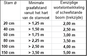 Bij de plaatsbepaling van kabels of leidingen in de nabijheid van bomen wordt de afstand tussen het kabel- en leidingentracé en de stam van de boom bepaald door onderstaande minimale afstanden. Zie ook Bomenposter hoofdstuk 10, bijlage 10.4. van het handboek. De leidraad staat in onderstaande tabel: