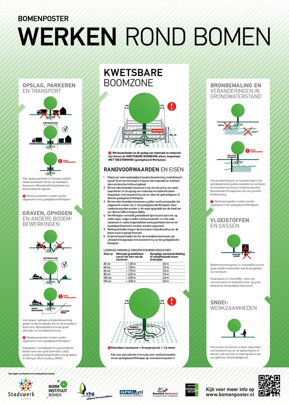 Het Norminstituut Bomen heeft als doel de kwaliteitszorg rond bomen te verbeteren. Het instituut ontwikkelt en standaardiseert kwaliteitseisen, richtlijnen en normen voor werkzaamheden in, rond en met bomen. De bomenposter 'Werken rond bomen' toont de kwetsbare boomzone direct rond een boom en laat zien welke belangrijke randvoorwaarden er gelden binnen deze kwetsbare boomzone voor de uitvoering van werkzaamheden.