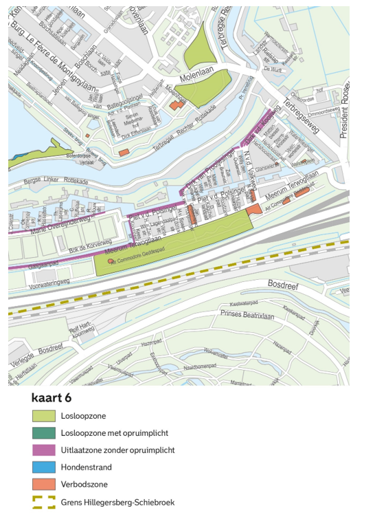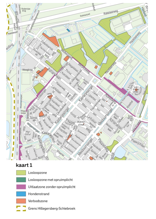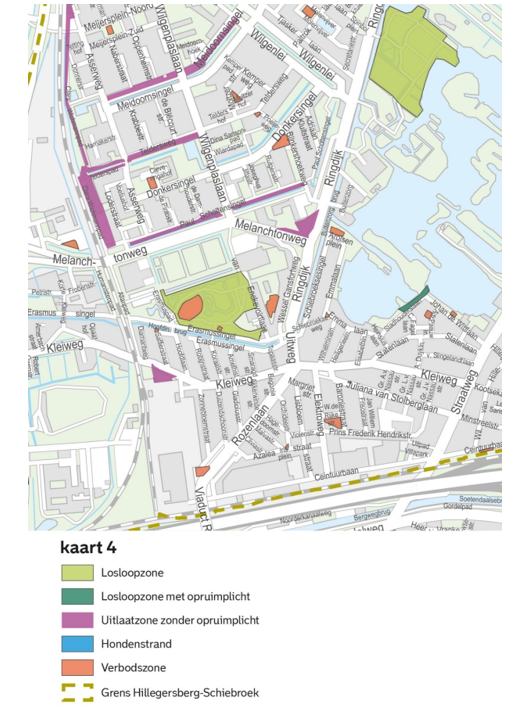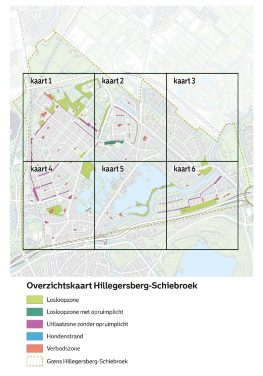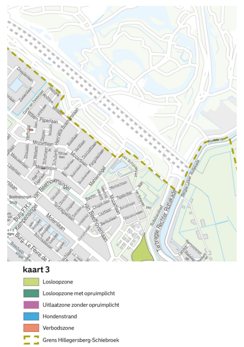 ‘Schiebroeksepark, het gebied begrensd door Berberisweg, Hazelaarweg en Doenkade, inclusief het hondenstrandje op het schiereiland in de noordwestelijke hoek van het park, met uitzondering van het terrein van Natuurtalent, het gedenkbos, V.T.V. Lusthof, de sportvelden in het noordoosten, het terrein van de manege, de speelplek inclusief omringend grasveld in de zuidwestelijke hoek van het park, tegenover Berberisweg 4 tot en met 446 en het overige oppervlak van het schiereiland in de noordwestelijke hoek van het park, niet zijnde hondenstrand’.