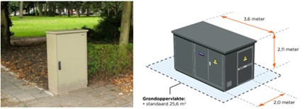 Figuur SEQ Figuur \* ARABIC 1 Voorbeeld van een buitenkast voor laagspanning (l) en afmetingen van een compact station voor middenspanning (r)