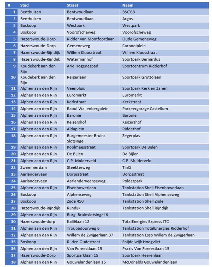 In totaal zijn er 38 geschikte locaties geïdentificeerd, waar nu nog geen snelladers staan, maar waar snelladers in de basis goed passen en gewenst zijn. Hier komt het toekomstige nieuwe vrachtwagenparkeerterrein waarschijnlijk nog bij, zodra een locatie hiervoor gekozen is. Daarnaast kunnen er mogelijk ook bij huidige locaties waar snelladers staan nog extra laders geplaatst worden (dit is in deze fase nog niet nader onderzocht). Dit laat zien dat er in de basis voldoende geschikte locaties lijken te zijn om op middellange termijn een dekkend netwerk aan kortparkeerladers uit te rollen wat aan de vraag voldoet.