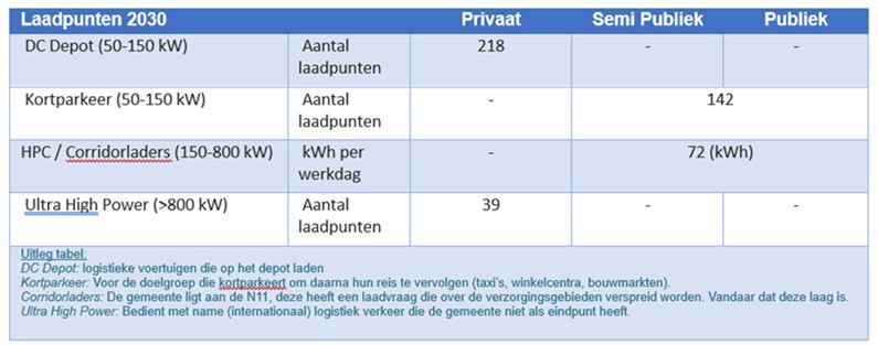 Voor de gemeente ligt er een opgave in het realiseren of faciliteren van kortparkeerlaadpunten voor de komende jaren – de vraag in hoeverre de gemeente hier pro-actief zelf locaties op openbaar terrein beschikbaar voor moet stellen komt in H5 aan bod. Het laden met hogere vermogens zal in de basis meer landen op private terreinen, vanwege de noodzaak om N2 en N3 voertuigen ’s nachts op depot te laden.