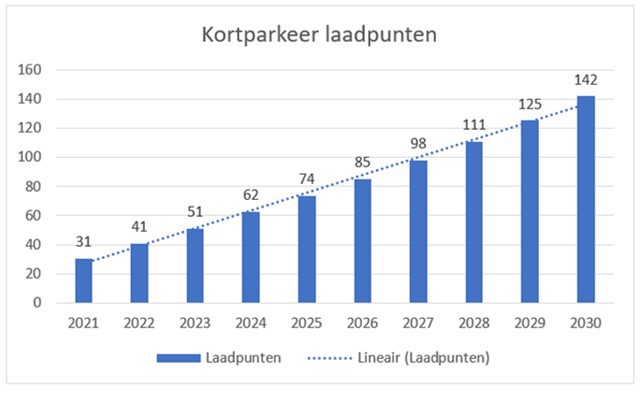 Als we inzoomen naar de opgave op het gebied van kortparkeerladers, dan hebben we in H4 gezien dat er een flinke uitdaging ligt om voldoende aanbod van snelladers op korte termijn te realiseren. Namelijk de groei van 11 naar 142 kortparkeerladers.