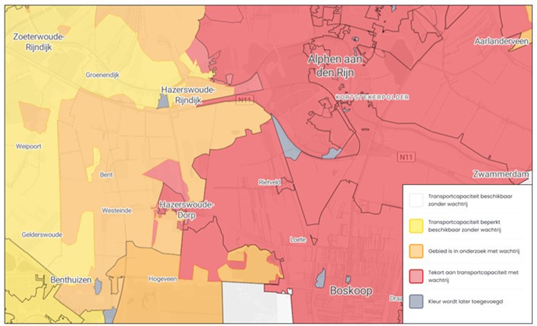 Belangrijk in de context van snelladen is de huidige staat van het elektriciteitsnet. In de gehele gemeente is sprake van netcongestie – zie Figuur 7. Dit betekent dat het elektriciteitsnet vol zit en er geen nieuwe grootverbruik aansluitingen gemaakt kunnen worden totdat er uitbreiding van netcapaciteit wordt gerealiseerd: in een deel van de gemeente is er pas na 2026 weer capaciteit voor nieuwe/verzwaarde aansluitingen, en voor een ander deel pas na 2029. Tot die tijd zal de realisatie van snelladers voornamelijk plaats kunnen vinden op locaties met een bestaande aansluiting en restcapaciteit. Denk hierbij aan energie intensieve bedrijven met onderbroken productietijden, of een evenementenaansluiting.