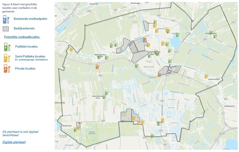 Te zien is verder dat er in ieder geval in elke kern meerdere locaties aanwezig zijn die passen bij de uitgangspunten over wat een geschikte locatie voor een snellader is. Ook is er een goede ruimtelijke spreiding te zien binnen de stedelijke gebieden van de gemeente. Zo zijn er binnen de voorgenomen zero emissie zone voor stadslogistiek in Alphen aan Den Rijn zelf een behoorlijk aantal locaties waar een eventuele toename in de snellaadvraag opgevangen kan worden.