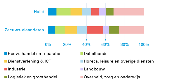Onderstaand figuur vergelijkt de verdeling van werkgelegenheid naar sectoren met Zeeuws-Vlaanderen. De Hulsterse economie kenmerkt zich ten opzichte van de regio met een groot aandeel werkgelegenheid in de sectoren overheid, zorg en onderwijs (waarvan dus met name banen in de zorg) en detailhandel. Verder is het aandeel werkgelegenheid in de sector Industrie fors kleiner ten opzichte van de regio.