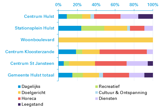 De vijf verschillende winkelgebieden hebben hun eigen accenten en karakter, zoals te zien in figuur 6. Centrum Hulst is een gevarieerd winkelgebied waar bezoekers veel beleving wordt geboden. Er is een breed aanbod van verschillende typen detailhandel, horeca, diensten dat wordt aangevuld door een klein deel cultuur & ontspanning. Stationsplein Hulst is een ondersteunend winkelgebied en kenmerkt zich als zodanig: het heeft een grote meerderheid van de verkooppunten in de drie detailhandelscategorieën en relatief weinig horeca, diensten en cultuur & ontspanning. We zien dat de woonboulevard een geheel monofunctioneel winkelgebied is. Centrum Sint Jansteen en Centrum Kloosterzande zijn kleinere winkelgebieden met een gevarieerd karakter.