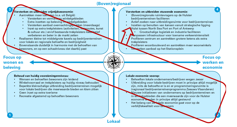 Om keuzes te maken voor de richting van onze economie die rekening houden met de uitdagingen, maar toch breed gedragen worden door gemeente en ondernemers, is het economisch kompas opgesteld (zie bovenstaande afbeelding – volledig kompas in bijlage 2. Bij het kiezen is rekening gehouden met de Hulsterse karakter, de kansen die de transities bieden en de belemmeringen waar de gemeente mee wordt geconfronteerd. We kunnen niet alles faciliteren. In samenspraak met ondernemers is de keuze gemaakt voor een combinatie van kwadranten 2 en 3. Voor de volledige uitwerking van de kwadranten, zie het koersdocument bijlage 2. In hoofdstuk 4 en 5 werken we deze keuze uit.