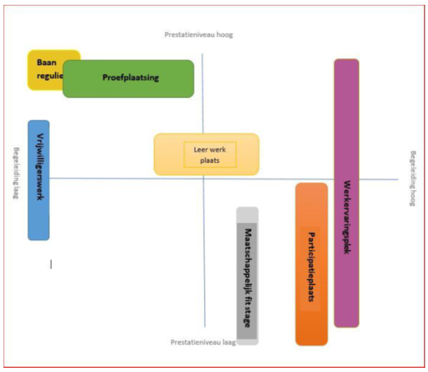 In de verschillende vormen van werken met behoud van uitkering is sprake van een opbouw in prestatieniveau en in begeleidingsniveau. In het figuur is per soort aangegeven wat het prestatieniveau en begeleidingsniveau is. Informatie over de leerwerplek is te vinden in artikel 14 Scholing.