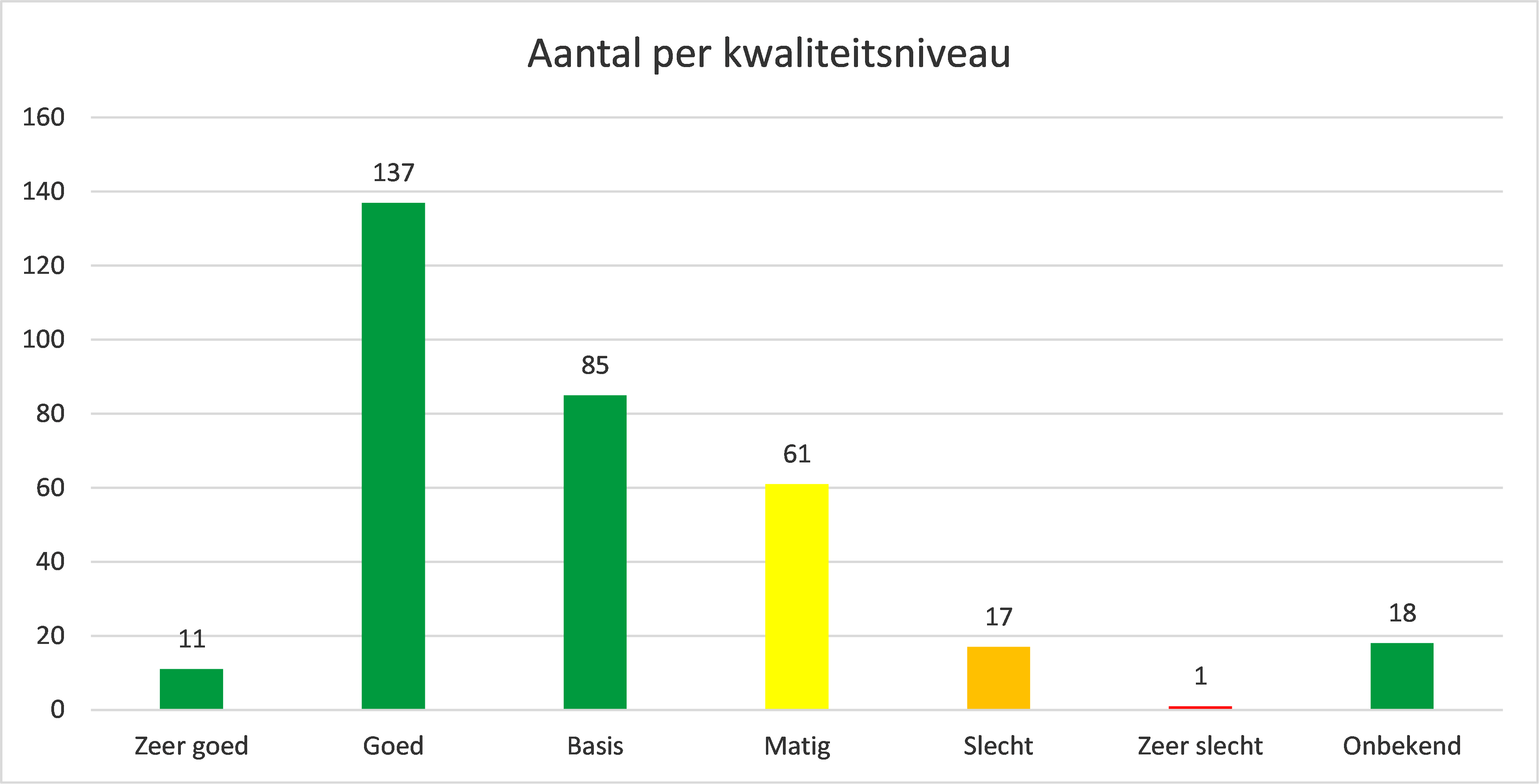 De inspectieresultaten tonen aan dat ruim 70% van het areaal (233 van de 330 kunstwerken) voldoet aan het gewenste kwaliteitsniveau Basis (zie hoofdstuk 4). Van 18 kunstwerken is het kwaliteitsniveau onbekend. Dit betreffen over het algemeen duikers die voor inspectie niet toegankelijk zijn. Er zijn 61 kunstwerken die kwaliteitsniveau matig hebben. Met het vaste en correctieve onderhoud (zie hoofdstuk 5) worden deze kunstwerken weer op het kwaliteitsniveau Basis gebracht.