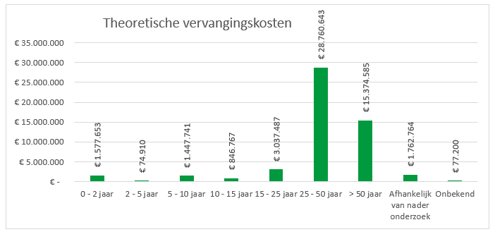In onderstaande figuur staat een overzicht van de theoretische vervangingskosten die er de komende jaren aankomen gebaseerd op de technische restlevensduur. Deze vervangingskosten zijn een schatting op basis van de financiële waarde van het areaal. Het is dus een indicatie van de daadwerkelijke vervangingskosten en dit kan dus nog veranderen. In totaal is de vervangingswaarde van het areaal bijna € 53 miljoen.