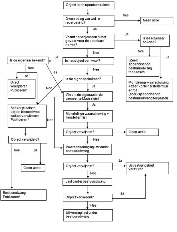 Als het niet duidelijk is wie de eigenaar van het voorwerp is wordt het voorwerp voorzien van een sticker. De sticker functioneert als vooraankondiging van bestuursdwang en de casus wordt gepubliceerd op Facebook, Instagram en in Nieuwsblad Maassluis. In de publicatie wordt een hersteltermijn bekend gemaakt.