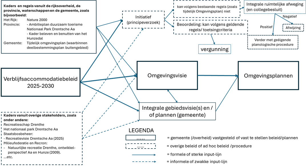 In dit hoofdstuk bespreken we de positie en betekenis van het accommodatiebeleid in relatie tot een aantal andere bestaande en toekomstige beleidskaders. Een nadere toelichting op de overige bestaande kaders, vindt u in bijlage 4. Welke kaders en welke procedure feitelijk van toepassing zijn voor de beoordeling van een nieuwe ontwikkeling, hangt af van de aard en de locatie van een toeristisch-recreatieve ontwikkeling.