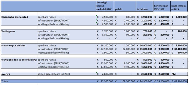 In onderstaande tabel wordt per gebied (vier gebieden), in hoofdlijnen de benodigde investeringen in openbare ruimte, infrastructuur en parkeren de locatie en gebiedsontwikkelingen weergegeven.