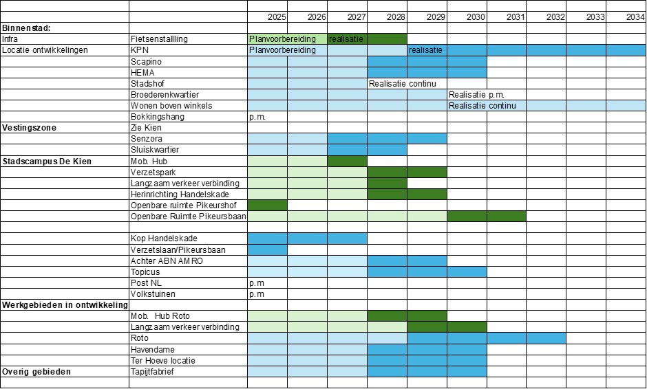 De maatregelen die in de planning in het groen zijn opgenomen betreffen de maatregelen aan de openbare ruimte die door de gemeente worden opgepakt. In de lichtgroene kleur de planvoorbereiding, in de donkergroene kleur de fase van de realisatie. De maatregelen in de planning in het blauw betreft de locatie- en gebiedsontwikkelingen met woningen. Sommigen worden uitgevoerd door ontwikkelaars, anderen zijn door gemeente vanuit een actieve rol opgepakt.