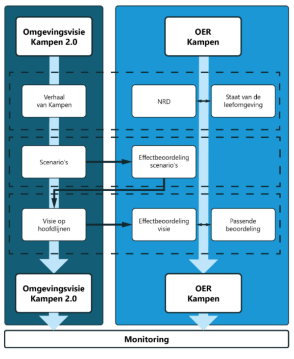We hebben ervoor gekozen om het proces van de omgevingsvisie en het OER gelijktijdig op te laten lopen. Op deze manier konden keuzes en ambities in de 75%-versie van de omgevingsvisie al beoordeeld worden op hun effecten en is de uiteindelijke omgevingsvisie op onderdelen aangescherpt om ongewenste effecten op het milieu en de omgeving van de gemeente Kampen dempen.