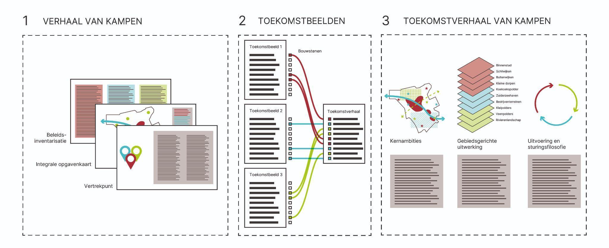 Met de grote hoeveelheid opbrengsten uit de participatieronde in de eerste fase werd in deze fase een toekomstverhaal voor de gemeente Kampen in 2050 opgesteld. Deze bestond uit drie hoofdambities met bijbehorende strategische keuzes en een visiekaart voor de gemeente. Tijdens de Avond van Kampen en online reactiemogelijkheden met onder andere een interactieve kaart konden inwoners wederom reageren, op basis waarvan de hoofdambities en visiekaart verder zijn aangescherpt.Vervolgens zijn, op basis van de hoofdambities en strategische keuzes uit het Toekomstverhaal, een gebiedsgerichte uitwerking gemaakt voor de verschillende deelgebieden in de gemeente (stad en grote dorpen, kleine dorpen, werklocaties, buitengebied en buurtschappen: ieder met eigen ‘sub’deelgebieden). Deze uitwerking is wederom fysiek (tijdens een reizende expositie op diverse locaties in de gemeente) en digitaal voorgelegd aan de inwoners en vervolgens verder aangescherpt.