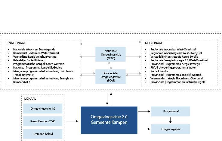De omgevingsvisie die we voor Kampen maken is zelfbindend. Dit betekent dat de omgevingsvisie alleen verplichtingen schept voor de gemeente als opsteller van het document. De omgevingsvisies van het Rijk en van de provincies werken dus niet rechtstreeks door in de omgevingsvisie van de gemeente. Wel zijn er veel opgaven waaraan we werken die gemeentegrensoverstijgend zijn en die daarom om een gemeenteoverstijgende aanpak en/of regionale samenwerking vragen. De uitgangspunten uit de Nationale Omgevingsvisie (NOVI) en Provinciale Omgevingsvisie (POVI) van Overijssel dienen hierbij als vertrekpunt. Deze (boven)lokale richtlijnen, beleid en wetgeving bepalen gezamenlijk de bewegingsruimte waarbinnen de Kampse omgevingsvisie vorm moet krijgen. Van het waterschap ontvingen we als input voor de langetermijnvisie een ‘position paper'. Ook zal de omgevingsvisie wat betreft de verschillende belangrijke thema’s zorgvuldig worden afgestemd op ander beleid en vice versa. In de volgende figuur laten we de samenhang van de verschillende beleidsstukken op lokaal en bovenlokaal schaalniveau zien.