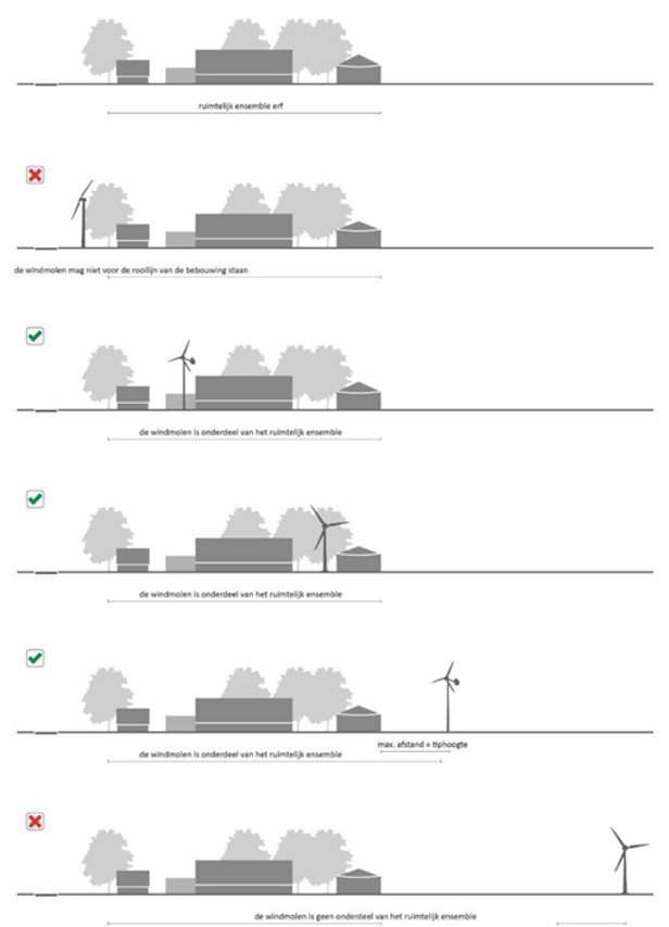 Het uitgangspunt is het plaatsen van de windturbine binnen het bouwvlak. Indien aantoonbaar dat dit niet tot de mogelijkheid behoort (ook bij het ontbreken van een bouwvlak) en er geen zwaarwegende bezwaren zijn, kan overwogen worden de windturbine buiten het bouwvlak en aansluitend op bestaande bebouwing of erfindeling te plaatsen, mits direct grenzend aan het bouwvlak zonder aantasting van de landschappelijke waarden. Indien buiten het bouwvlak geplaatst, moet de windturbine binnen het bestemmingsvlak geplaatst worden met een afstand tot het ruimtelijk ensemble van maximaal de tiphoogte (zie figuur 1).