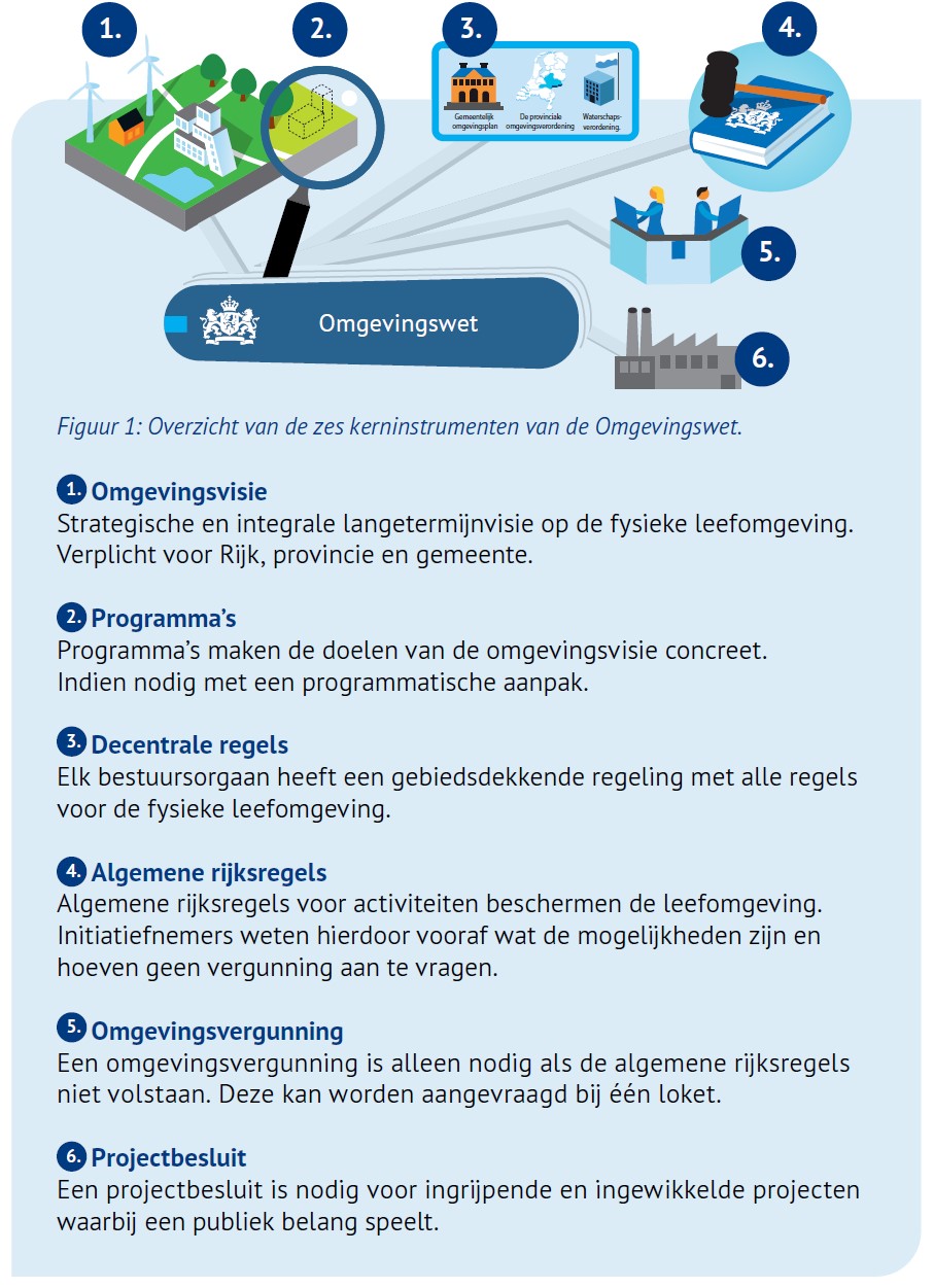 De Omgevingswet bestaat uit zes kerninstrumenten (figuur 1): de omgevingsvisie, programma’s, het omgevingsplan, algemene regels, omgevingsvergunningen en projectbesluiten.