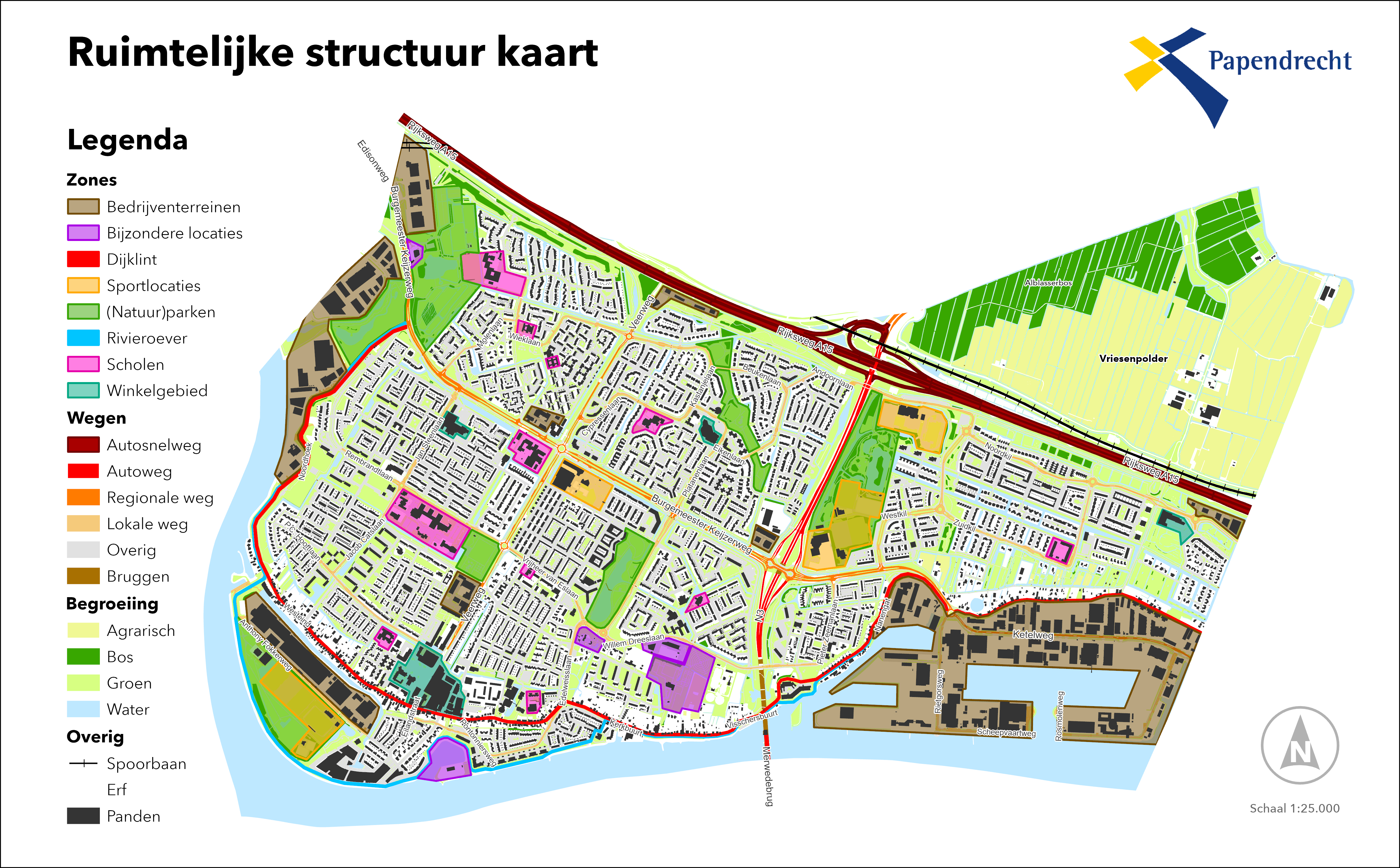 Het grondgebied van de gemeente Papendrecht is één van de kleinste van Nederland. Omdat we toch nog zo’n 32.000 inwoners hebben, is bijna ons hele grondgebied bebouwde kom. Zoals te zien op figuur 2 is alleen de Vriesenpolder nog open gebied. De A15 en Betuwelijn lopen in onze gemeente naast elkaar. Samen vormen zij een duidelijke grens tussen het bebouwd gebied van Papendrecht en het open landschap van de Alblasserwaard. Naast de A15 is de N3 een bovenlokale belangrijke verkeersader. Binnen de gemeente zijn de Burgemeester Keijzerweg en de Veerweg de belangrijkste wegen. Papendrecht grenst via land aan de gemeenten Sliedrecht, Alblasserdam en Molenlanden. Met de Merwedebrug hebben we een directe verbinding met Dordrecht. Alle Drechtsteden samen vormen een agglomeratie van ruim 270.000 inwoners.