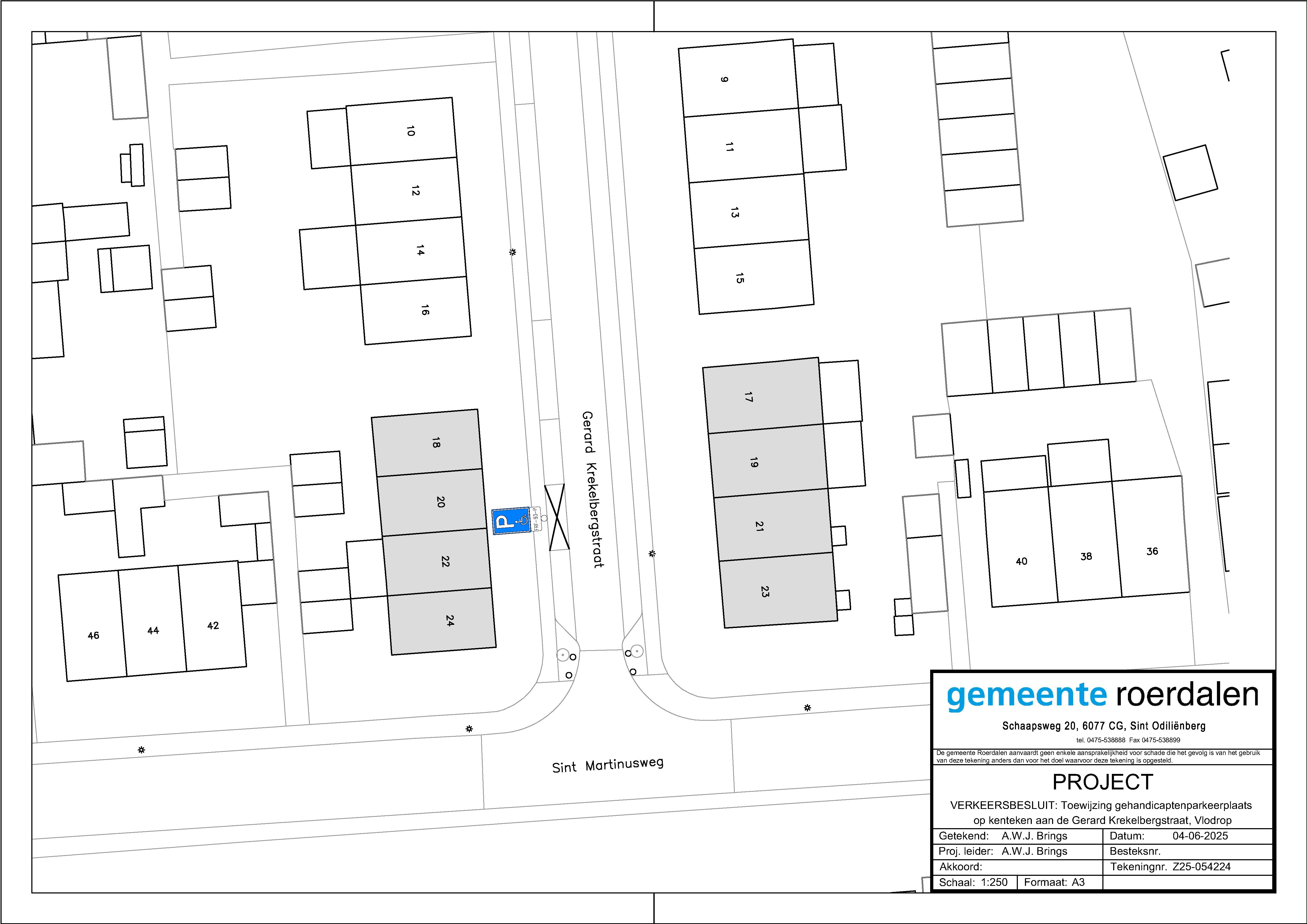 De gehandicaptenparkeerplaats op kenteken wordt gerealiseerd door het plaatsen van het verkeersbord E6 (RVV 1990) inclusief onderbord OB309 (RVV 1990) met het geldend kenteken van het voertuig en het aanbrengen van ondersteunende markering op de parkeerplaats in de directe nabijheid van de desbetreffende rijtjeswoning aan Gerard Krekelbergstraat in Vlodrop.