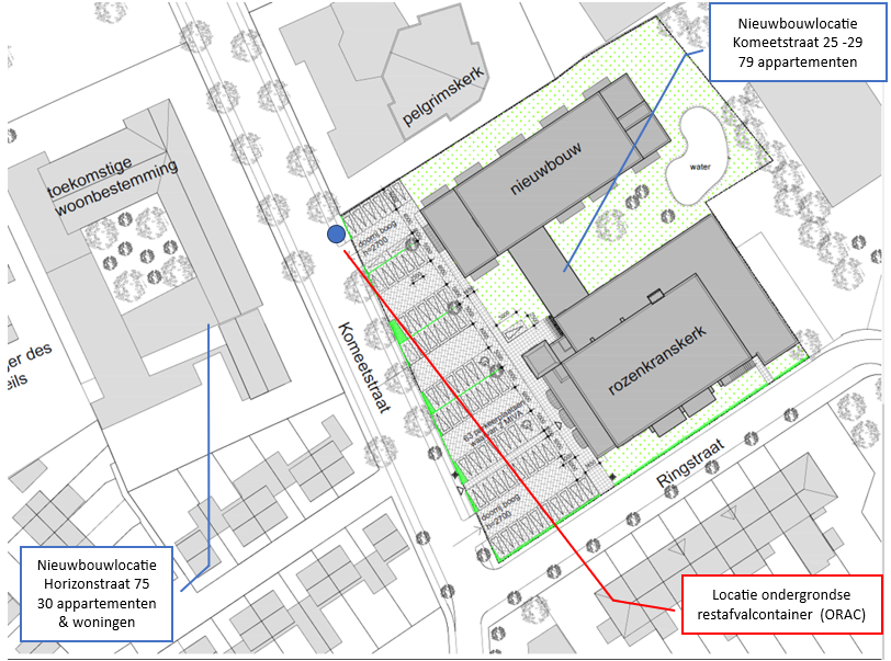 De inwerpopening van de ondergrondse afvalcontainer zal gericht zijn naar het nieuwcomplex aan de Komeetstraat. In geval van overlast kan deze gemeld worden via de BuitenBeter App van de gemeente Brunssum dan wel direct bij de Reinigingsdiensten Rd4.