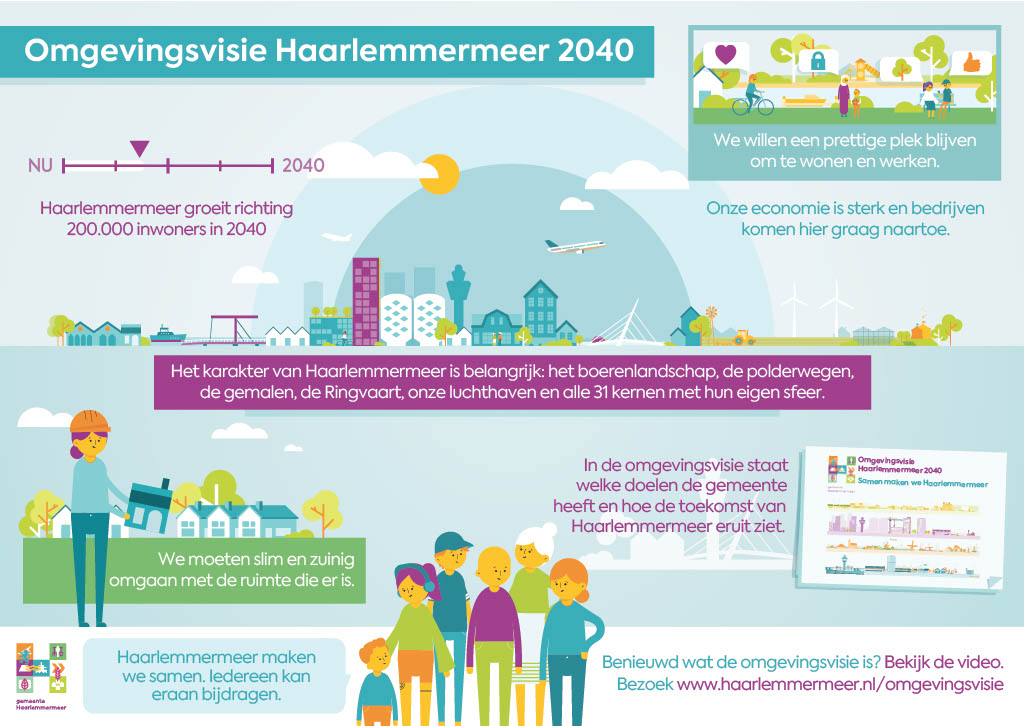 De Omgevingsvisie van Haarlemmermeer is met de veelheid aan thema’s behoorlijk ambitieus. We willen een prettige plek blijven om te wonen en werken. Goed bereikbaar, groen en schoon met genoeg plekken waar mensen elkaar kunnen ontmoeten en kunnen bewegen in de buitenlucht. Je moet hier gezond en veilig kunnen leven. Ook het karakter van Haarlemmermeer is belangrijk: het boerenlandschap, de polderwegen, de gemalen, de Ringvaart, onze luchthaven en alle 31 kernen met hun eigen sfeer.