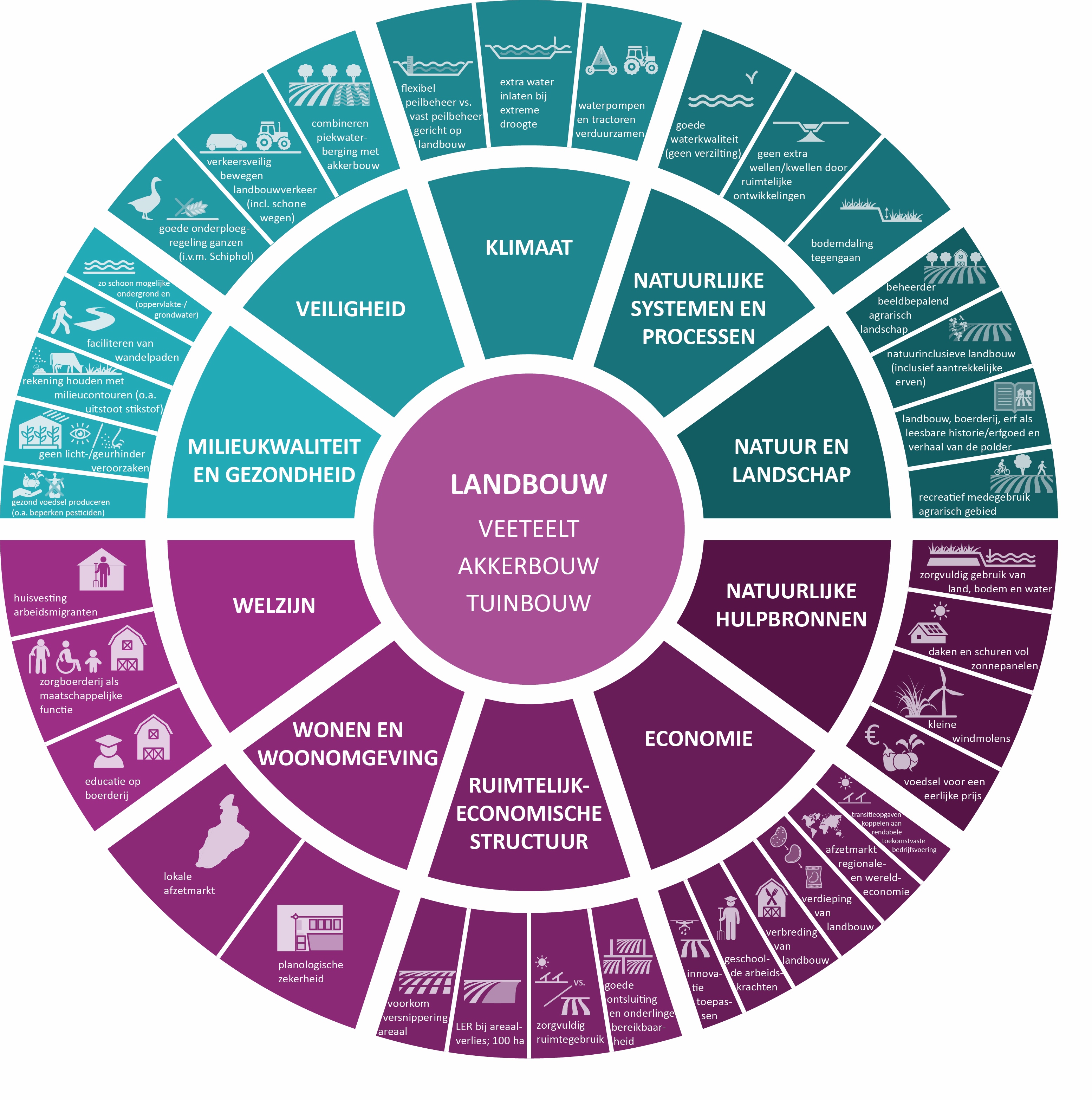 Daar komen nieuwe opgaven uit voort als: hernieuwbare energie opwekken, circulair omgaan met grondstoffen en bouwmaterialen, slimme en elektrische mobiliteit, meer zorg voor de agrarische bodem, energieneutraal of -opwekkend bouwen, slim mengen van functies dichter bouwen waar het kan, duurzamere datacenters, water vasthouden en minder doorspoelen in onze poldersystemen, meer planten- en diersoorten en de wens om gezondheid meer centraal in ons handelen te stellen.