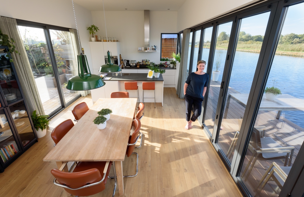Interieur van een duurzame woonboot aan de Ringvaart bij Vijfhuizen