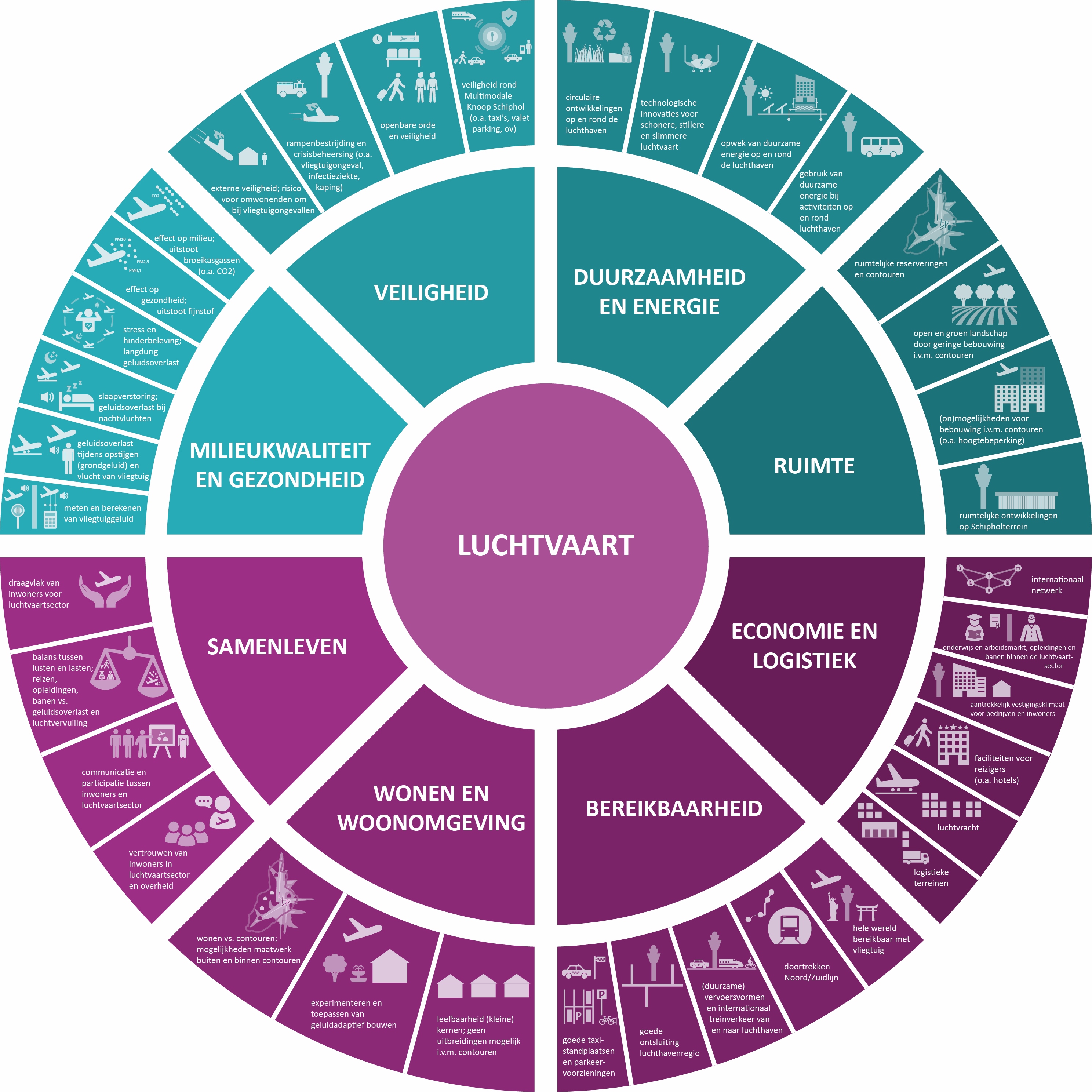 Haarlemmermeer heeft ervoor gekozen een breed aantal thema’s in de Omgevingsvisie op te nemen. In de omgevingsgesprekken met onze inwoners en ondernemers en in discussies van onze raadsleden, kwamen zonder uitzondering zeer uiteenlopende thema’s aan bod die allemaal van belang zijn. Onze Omgevingsvisie gaat onder meer over veiligheid, wonen, milieukwaliteit, landschap en groen, economie, water, energie en luchthaven. Bijzonder is dat ook gezondheid als thema in onze visie is opgenomen.