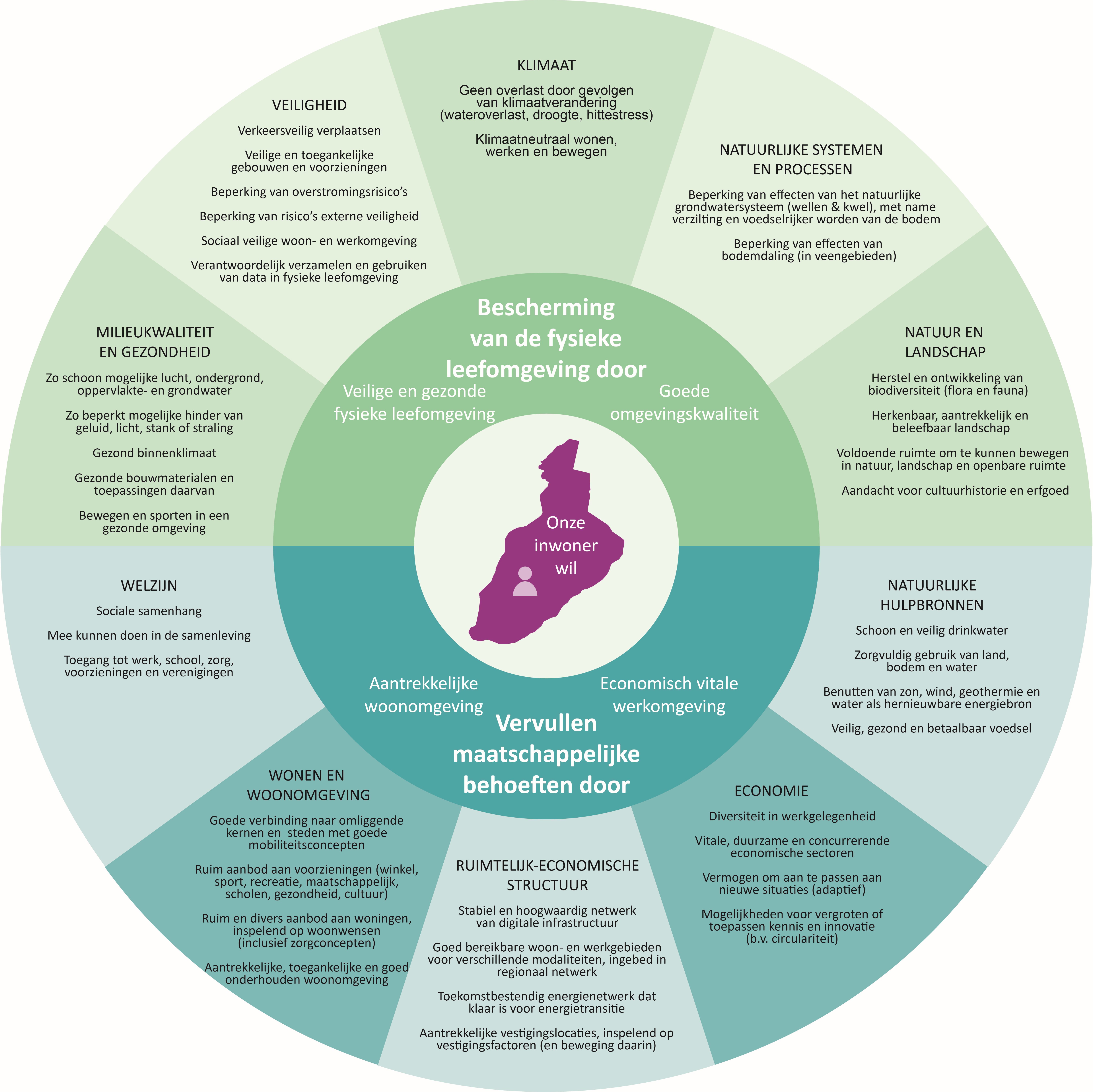 Economische sectoren zijn bezig met transitie door anders om te gaan met energie en grondstoffen en het creëren van toegevoegde waarde. Klimaatverandering maakt dat we anders gaan denken over hoe en waar we energie opwekken. We hebben meer aandacht voor gezondheid en milieukwaliteit (groen, lucht, bodem, water, geluid, voedsel, biodiversiteit). Vanuit ons eigen belang bezien, maar ook vanuit het belang van de natuurlijke omgeving. Onze opgave om woningen te bouwen en ruimte voor werkgelegenheid te bieden (de verstedelijkingsopgave) koppelen we nadrukkelijk aan mobiliteit enerzijds en aan groen en landschap anderzijds. Dit voor aantrekkelijke en gevarieerde woon- en werkmilieus. We willen in onze gemeente veilig en plezierig met elkaar leven en ‘wel zijn’. Het hebben van werk en een woning zijn daarbij de basisvoorwaarden.