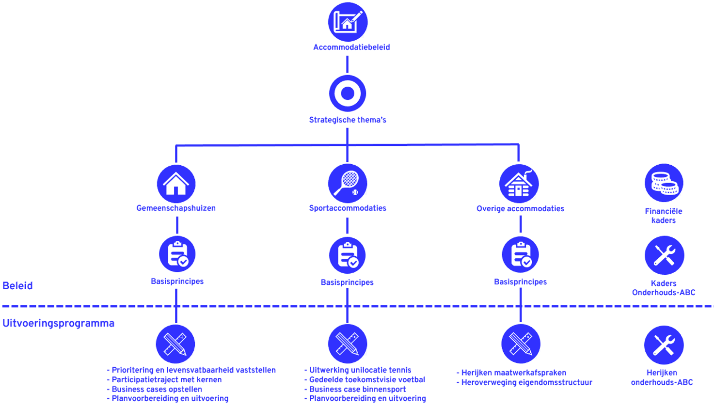 In voorliggend rapport worden beleidskeuzes gemaakt. Deze zullen een concrete uitwerking krijgen in de verschillende types van maatschappelijke accommodaties. Onderstaand schema laat zien hoe het accommodatiebeleid is opgebouwd en welke acties c.q. werkzaamheden in het uitvoeringsprogramma een plek zullen krijgen.