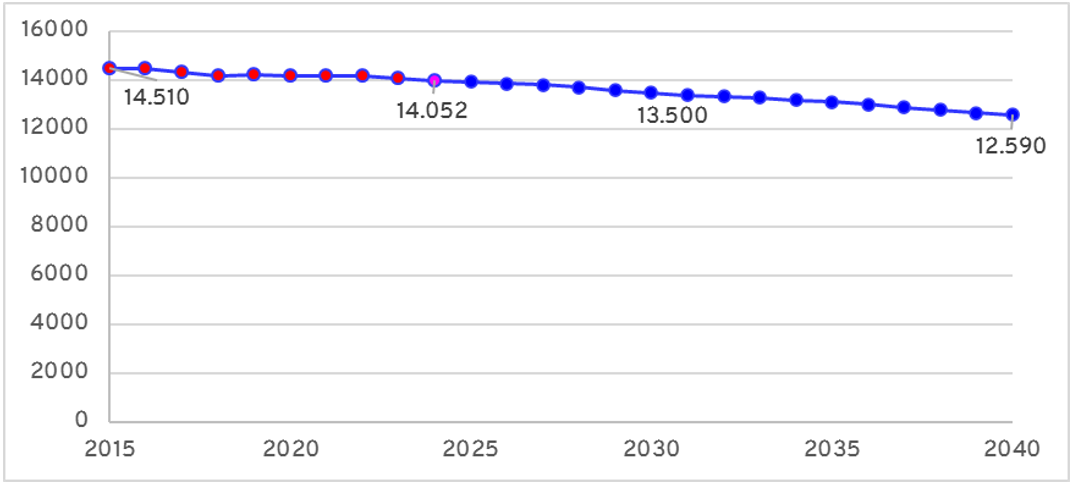 Figuur 02 1 Bevolkingsontwikkeling 2015 - 2024 en bevolkingsprognose 2024 - 2040 (CBS, 2024 & E'til 2024)