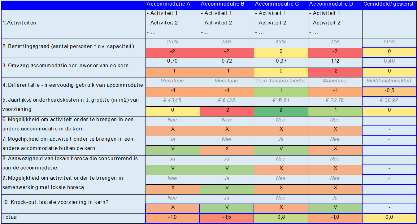 Het verenigingsleven in de verschillende kernen is erg divers en dit vertaalt zich in de aard en omvang van accommodaties in de kernen. De situatie van nu is anders dan 10 jaar geleden en niet alle accommodaties zijn passend voor het huidig gebruik. Er is behoefte aan een beoordelingssystematiek om, waarbij op basis van objectieve criteria maatschappelijke voorzieningen vergeleken kunnen worden om te komen tot een evenwichtige verdeling van de middelen. Daarvoor is een matrix ontwikkeld, met de strategische thema’s als uitgangspunt, die als beoordelingssystematiek kan dienen. Daarbij is ervoor gekozen dat het geen instrument wordt om normatieve grenzen te stellen aan oppervlaktes, kosten, etc. De criteria en scores worden vastgelegd als volgt: