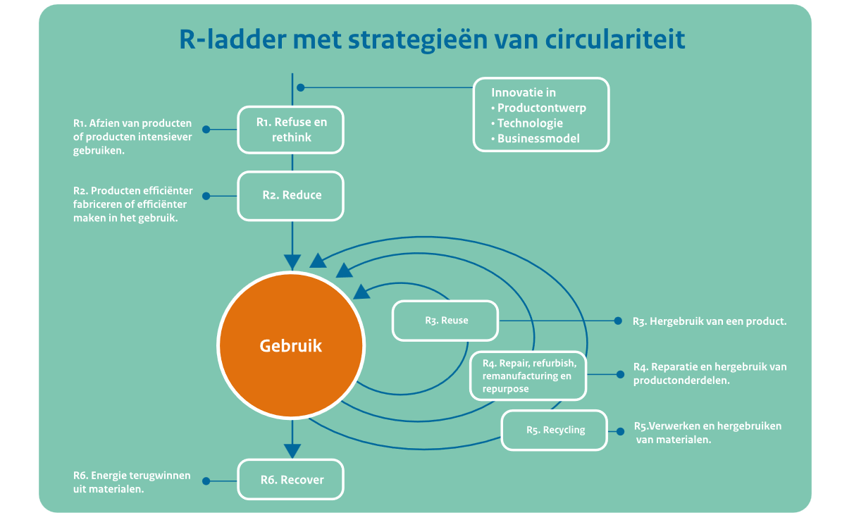 R-ladder: De R-ladder geeft de mate van circulariteit aan. De R-ladder heeft 6 treden (R1 tot en met R6) die verschillende strategieën van circulariteit weergeven. Strategieën hoger op de ladder, besparen meer grondstoffen. Hoe hoger een strategie op de R-ladder staat, hoe meer circulair de strategie is. Waarbij R1 de hoogste trede is;