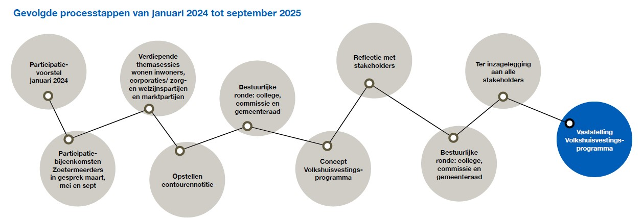 Het Volkshuisvestingsprogramma is tot stand gekomen in een participatief proces met stakeholders. Input van marktpartijen, zorg- en welzijnspartijen, inwoners, bewonersorganisaties, de woningcorporaties, beleidsmedewerkers van de gemeente en de gemeenteraad hebben onze visie waar nodig bijgestuurd en aangescherpt. Deze partijen zijn in een vroeg stadium geconsulteerd om – gevoed door eerste denkrichtingen – de lokale opgaven en ieders perspectief hierop te schetsen.
