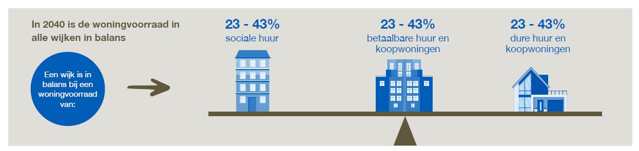 Het realiseren van een gebalanceerde verhouding in de woonvoorraad is een streven en geen harde doelstelling. Onze ambitie is om zoveel mogelijk naar een gelijke balans toe te werken met oog voor het unieke karakter van onze wijken. Dit betekent dat we op sommige plekken meer van de ene prijsklasse realiseren dan van de andere.