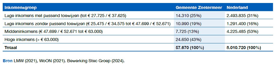 In Zoetermeer wonen relatief weinig huishoudens die tot de primaire doelgroep van woningcorporaties behoren (lage inkomens met passend toewijzen). Waar in heel Nederland 31% van de huishoudens tot deze doelgroep behoort, is dit in Zoetermeer 25%. We zien dat relatief veel huishoudens uit de secundaire doelgroep (lage inkomens zonder passend toewijzen) in Zoetermeer zijn vertegenwoordigd. Daarnaast heeft circa 13% van de huishoudens een middeninkomen tot € 63.000. Het aandeel hoge inkomens vanaf € 63.000 bedraagt circa 43%. Midden- en hoge inkomens bedragen samen 56% van de Zoetermeerse huishoudens. Dat is hoger dan het landelijk gemiddelde (53%).