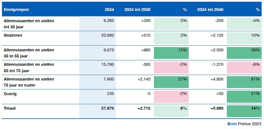De huishoudensgroei, de mate van vergrijzing en het fors kleiner worden van de gemiddelde omvang van een huishouden, zorgen ervoor dat de woonbehoeften van onze inwoners veranderen. Naar verwachting zal de vraag naar nultredenwoningen flink stijgen. Dit zijn woningen die geschikt zijn voor onze ouder wordende bevolking en mensen met (enige vorm van) een zorgvraag. De vraag naar nultredenwoningen is zowel aanwezig onder huurders als bij woningbezitters. Huishoudens wisselen daarbij niet snel van huur naar koop, of vice versa.