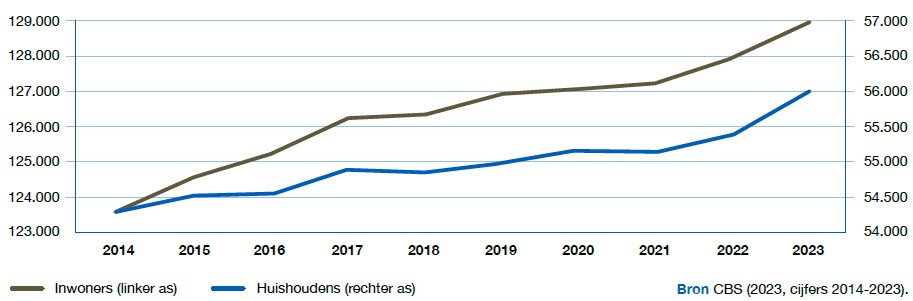 Wij zien Zoetermeer groeien en de samenstelling van de stad veranderen. De groep seniore inwoners groeit hard en er is sprake van 'dubbele vergrijzing': het aantal senioren groeit, en het aandeel senioren boven de 75 jaar groeit het hardst. Het aandeel eenpersoonshuishoudens neemt bovendien – deels door vergrijzing - toe. Deze en andere veranderingen hebben impact op zowel vraag als aanbod op de woningmarkt. Het volgende figuur laat de Zoetermeerse bevolkingsgroei van de afgelopen 10 jaar zien.