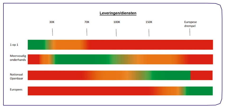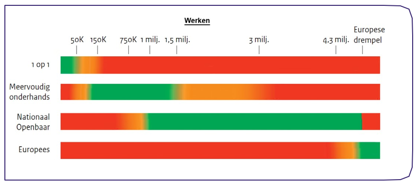 Voor de Europese drempelbedragen geldt, anders dan voor de richtbedragen, dat hier niet van mag worden afgeweken. De kleurenbalkjes 31 van bijlage 2 geven dit grafisch weer.