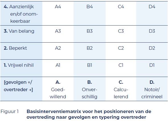 De handhaver5 bepaalt in welk segment van de in figuur 1 opgenomen matrix (de basisinterventiematrix) hij zijn bevindingen positioneert door (1) het beoordelen van de gevolgen van de overtreding voor de fysieke leefomgeving, zoals milieu, erfgoed, natuur, water, ruimtelijke ordening, veiligheid, gezondheid e.d., en (2) het typeren van de (vermeende) overtreder.6
