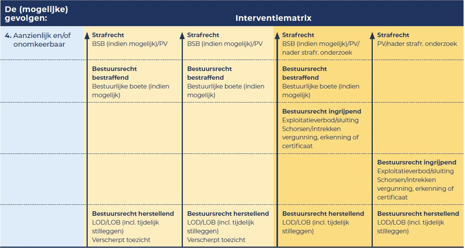 de overtreding heeft nadelige gevolgen voor de fysieke leefomgeving die niet (meer) kunnen worden weggenomen, zoals onherstelbare milieuschade, of de normadressaat heeft het anderszins niet (meer) in zijn macht om de rechtmatige toestand te herstellen. Hoe groter en/of ernstiger de schade, hoe eerder strafrechtelijke handhaving is geïndiceerd. Een overtreding met onomkeerbare gevolgen zal overigens veelal al meteen bij het indelen in de basisinterventiematrix (stap 1) in de zwaardere interventiecategorie vallen.