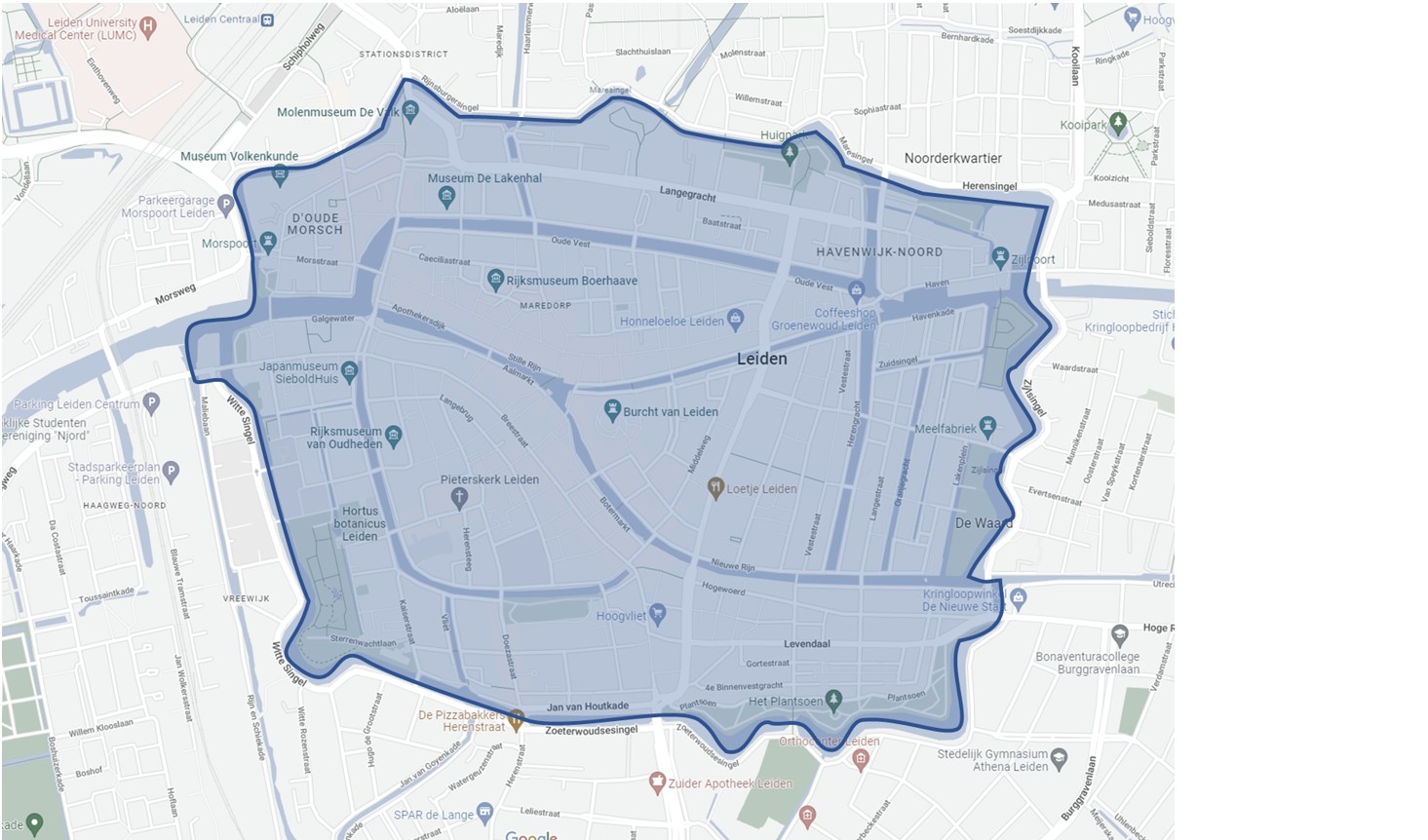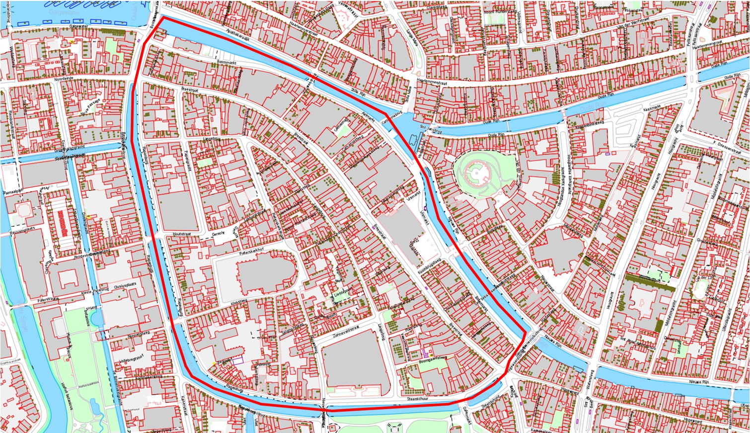 Omvat de volgende straten: Breestraat, Koornburgsteeg, Burgstreeg, Botermarkt, Nieuwe Rijn (deels), Beschuitsteeg, Nieuwstraat (deels), Moriaansteeg, Hooglandse Kerkgracht, Koppenhinksteeg, Van der Sterrepad, Oude Rijn (deels). De stegen tussen Breestaat/Aalmarkt vallen tevens onder het gebied.