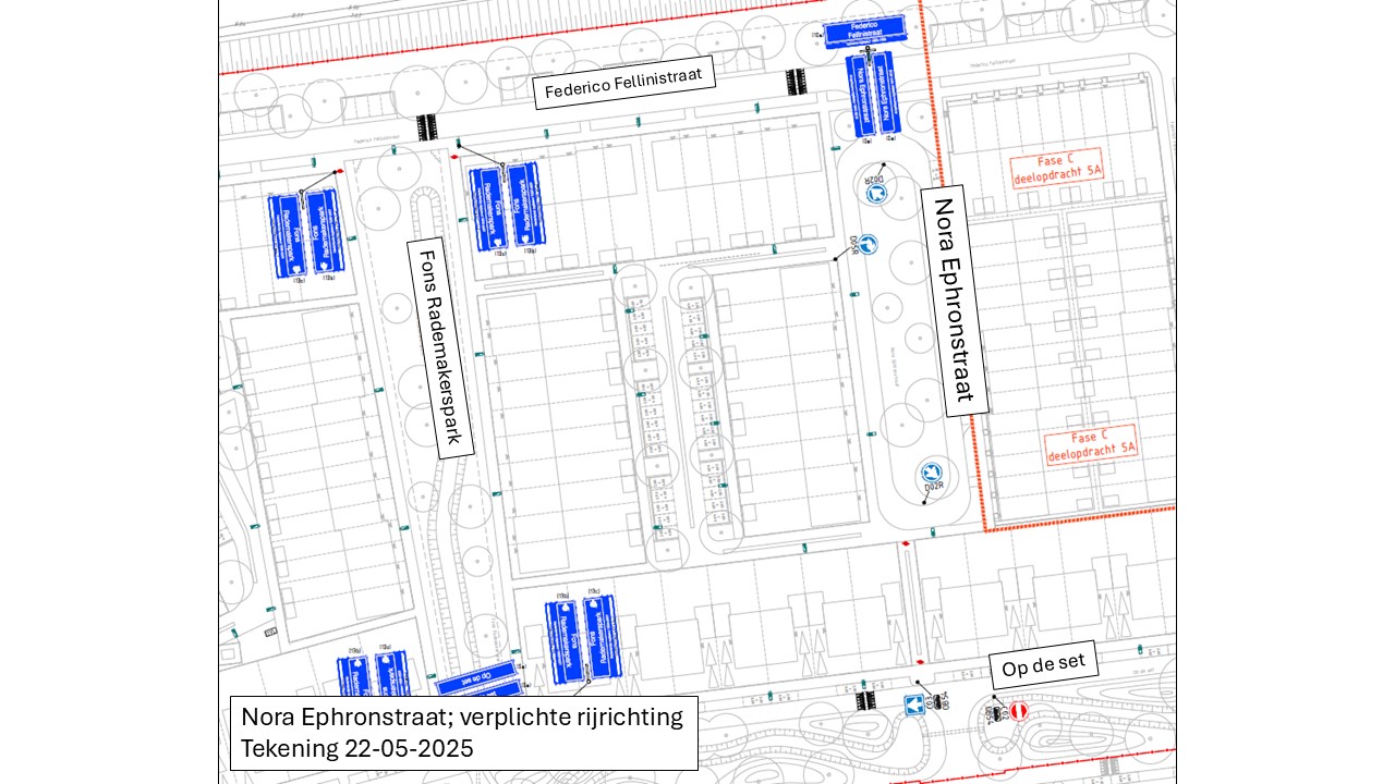 dat het tracé van de Nora Ephronstraat vanaf de Federico Fellinistraat richting Op de set voert en vanaf daar in noordelijke richting terug naar de Federico Fellinistraat;